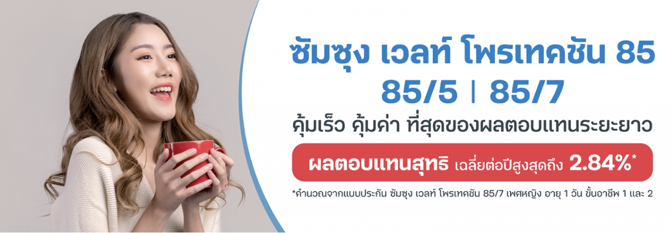 *คำนวณจากแบบประกัน ซัมซุง เวลท์ โพรเทคชัน 85/7 เพศหญิง อายุ 1 วัน ขั้นอาชีพ 1 และ 2